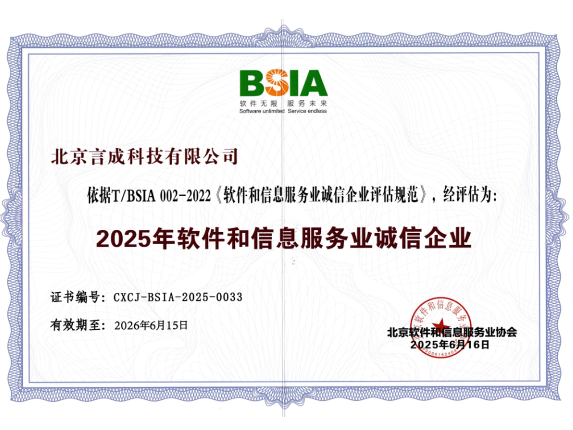 公司获得由北京软件和信息服务业协会颁发的【2025年软件和信息服务业诚信企业】荣誉证书